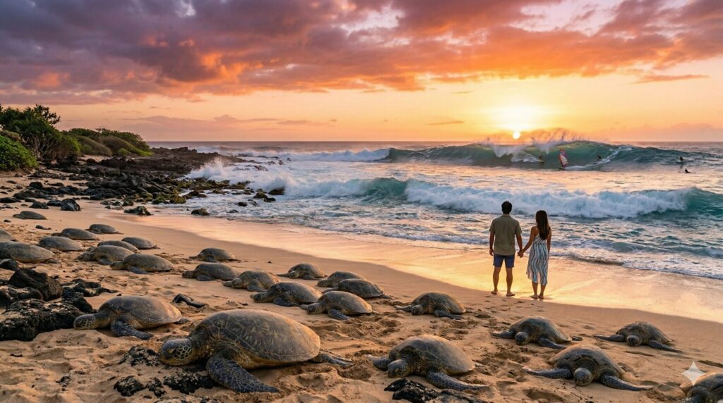 そして、このビーチのもう一つの主役が、ハワイ語で「ホヌ」と呼ばれる野生のグリーンシータートル(アオウミガメ)たちです。日中、海を優雅に泳いでいる姿を見かけることもありますが、ウミガメたちを確実に見たいなら、夕方の時間帯、特に日没の1〜2時間前を狙って訪れるのが一番のおすすめかなと思います。彼らは体を休めたり、体温を調整したりするために、夕方になると波打ち際の砂浜や岩場に次々と上陸してきます。多い日には数十匹ものウミガメが並んでお昼寝をしている、まるで魔法のような光景に出会えるんです。ホオキパの夕暮れは本当に特別なんですよね。