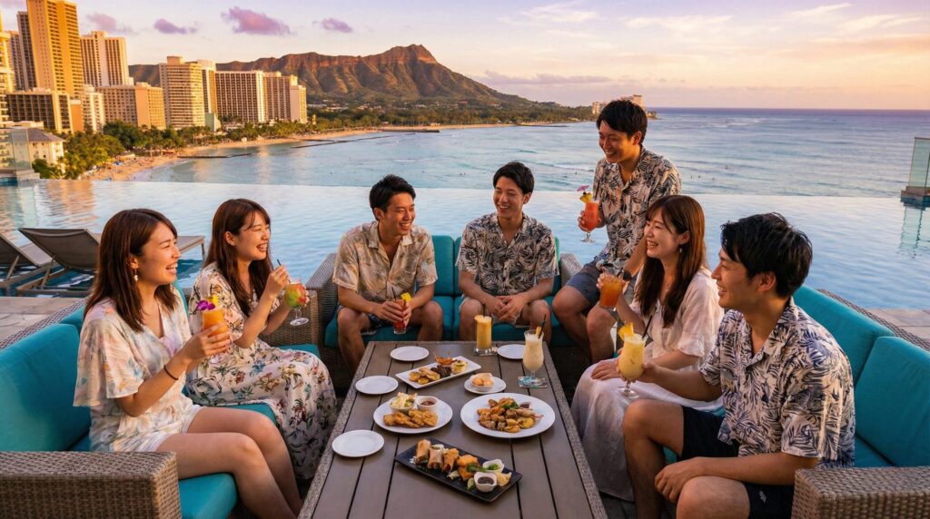 「予算は抑えたいけど、憧れの高級ホテルには泊まりたい!」というワガママを叶える最強の方法、それが4人グループでの旅行です。日本の旅館などとは違い、ハワイのホテルの多くは「1室あたりのルームチャージ制」を採用しています。つまり、定員内であれば何人で泊まっても部屋代は変わらないため、人数が多ければ多いほど1人あたりの負担額は激減するんです。