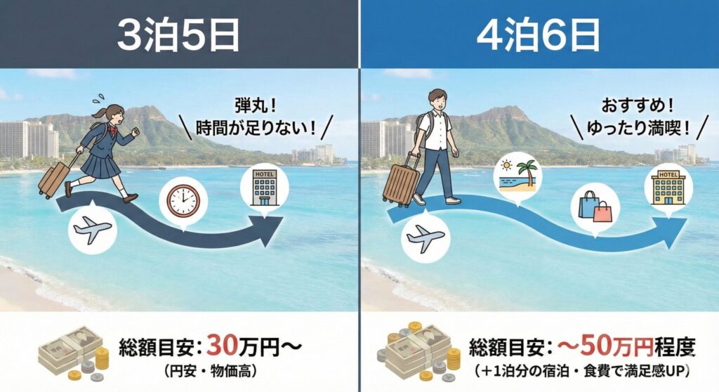 4泊6日にする場合、増える費用は「1泊分のホテル代」と「1日分の食費・雑費」のみです。航空券代は基本的に変わりません。ホテルを4人で1室シェアする場合、1人あたりの追加宿泊費は1〜2万円程度で済むことも多いです。この差額で、丸一日フリータイムが増え、ノースショアまで足を伸ばしたり、ビーチで何もしない贅沢な時間を過ごしたりできるなら、コストパフォーマンスは非常に高いと言えます。